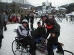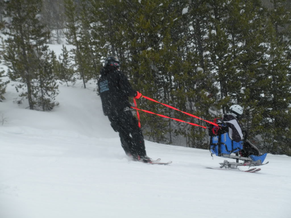 As it turned out, I loved it. I had worried participating as a quadriplegic would make me miss the joys of able-bodied skiing too much. But I discovered adaptive skiing had some joys of its own. For starters, I was tethered to a really good skier. J.P. was much better than I had ever been. As a result, I was able to go much faster in my “bucket” (correct term sit-ski or mono-ski) than I ever could’ve gone on my own. I was able to enjoy the wind in my face like never before! And, as someone who always found great fun in falling down, I will tell you there were even enough near misses and short stops on that busy weekend to keep me entertained. As we returned to the Center on our last day, anticipating hot showers and hot toddies, I noted one more upside — no equipment to lug! (Sorry, I can’t say the same for J.P.)